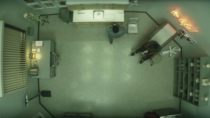 Когда камера фиксируется на месте, а Хэйди готовится начинать, жалюзи по обе стороны от нее визуально создают рамку в кадре, размеры которой имеют соотношение сторон 1:1. Впоследствии оно будет использоваться для разделения сцен прошлого и настоящего. Такой эффект сужения подспудно наталкивает на мысли, что несмотря на то, что Хэйди важно сидит за большим столом, как серьезный доктор, ее компетенция и знания вызывают сомнения. И что самое интересное — данное визуальное решение было принято создателями сериала практически интуитивно.