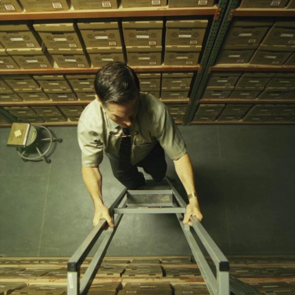 Ракурс съемки с самой нижней точки инспектора Карраско, сидящего на полу в архиве, заваленном несметным количеством коробок, которые любой исследователь не смог бы изучить за всю жизнь, заставляет подумать о его положении — место Томаса у самой земли. Посреди нависающих переполненных коробок с бумагами и брошюрой компании Heist, закрывшей его лицо, маленький человек Томас Карраско полностью обезличен, окружен и сдавлен, практически сливается с окружающим его океаном информации.